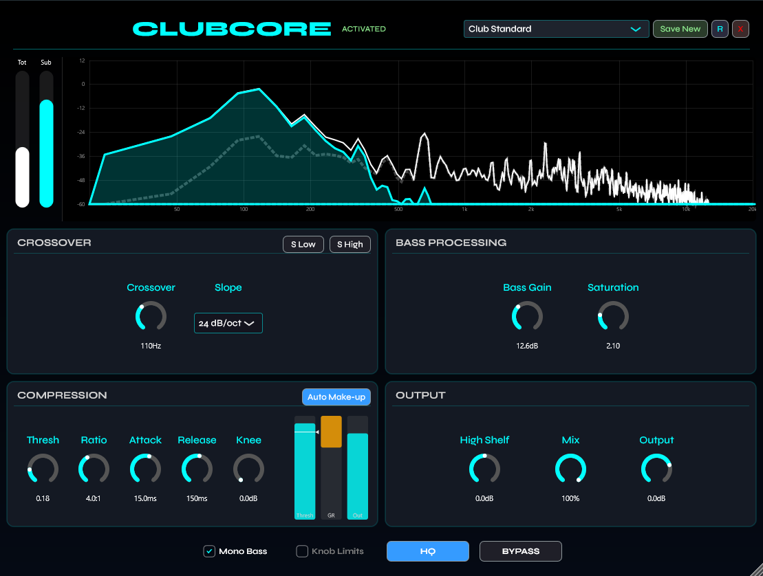 CLUBCORE is a high-fidelity effect plugin designed for bass frequency enhancement. It uses parallel band splitting to isolate and process lows with dynamics, harmonics and spatial treatment — while keeping highs crystal clear.