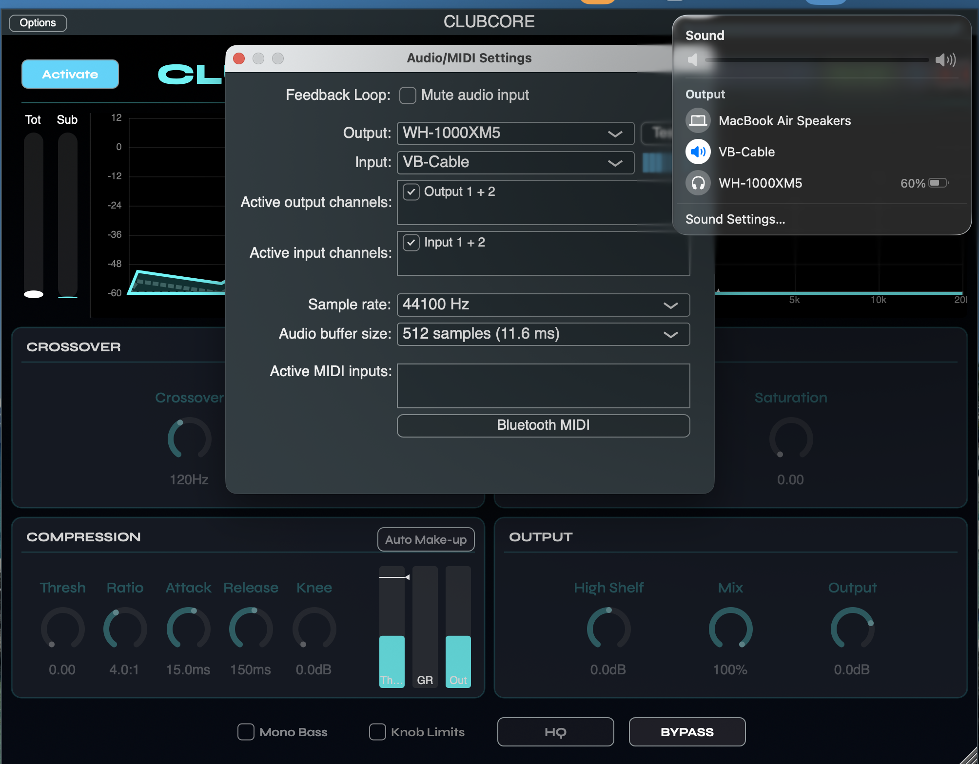 This visualization illustrates the complete signal path: routing your DJ software output to the Virtual Cable, capturing it as the Input in CLUBCORE, and finally monitoring the processed low-end through your primary audio interface.